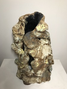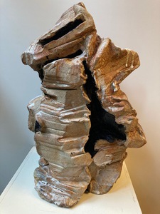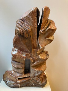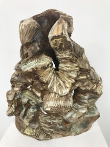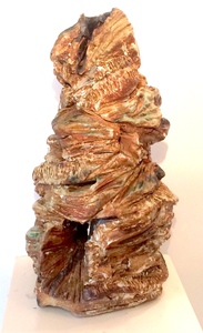 2020Abstract beeld van klei. Glazuren: slibs en oxydes. Het beeld is hooggestookt, d.w.z. dat het evt ook buiten kan staan. Kleuren: geell,bruin, beige, wit.