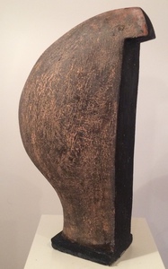 2017beeld vrouwelijke vorm, witte chamotte klei, met bewerkte huid, ingewassen met mangaan en ijzeroxide.
