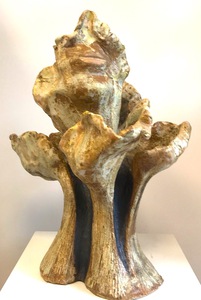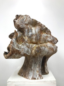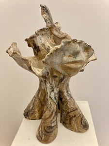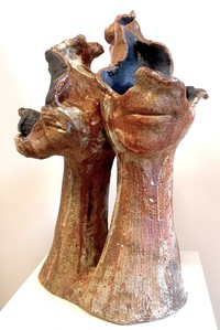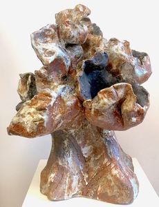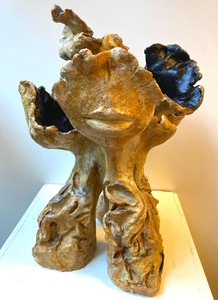 2022Beeld van klei, abstract. Natuur. Boomachtig vorm met onderdelen van gezichten. Het beeld is hooggestookt , d.w.z. het beeld kan buiten en binnen staan. Kleuren bruin, oranje, geel, wit. Materiaal: Klei, glazuren, oxydes. Tegen meerprijs kan het beeld op een (bijv stenen) sokkel gemonteerd worden.