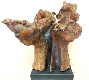 2022Beeld van klei, abstract. Natuur. Boomachtig vorm met onderdelen van gezichten. Het beeld is hooggestookt , d.w.z. het beeld kan buiten en binnen staan. Kleuren zwart, bruin, geel. Materiaal: Klei, glazuren, oxydes. Tegen meerprijs kan het beeld op een (bijv stenen) sokkel gemonteerd worden.